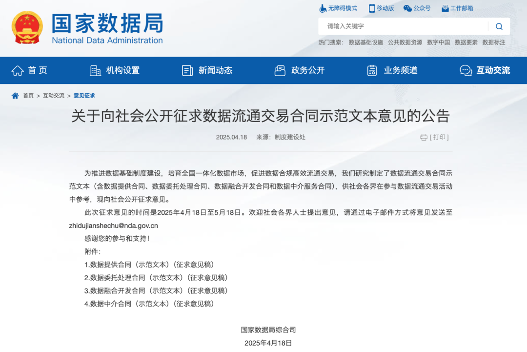 2025年 4 月 18 日,为推进数据基础制度建设,培育全国一体化数据市场,促进数据合规高效流通交易,国家数据局综合司研究制定了数据流通交易合同示范文本(含数据提供合同、数据委托处理合同、数据融合开发合同和数据中介服务合同),供社会各界在参与数据流通交易活动中参考,现向社会公开征求意见。